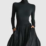 Ten oszałamiający zestaw składa się z plisowanej spódnicy maxi z wysokim stanem i eleganckiej, dopasowanej bluzki z długim rękawem. Szeroki pas spódnicy podkreśla linię talii, podczas gdy pełna, płynąca tkanina dodaje dramatycznego ruchu przy każdym kroku. Gładki, dopasowany top równoważy całość, tworząc elegancką sylwetkę, która jest zarówno wyrafinowana, jak i ponadczasowa.