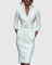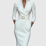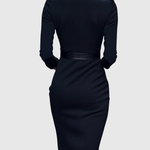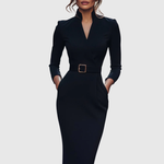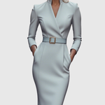 Ta sukienka ma wyrafinowany dekolt w stylu mock wrap, rękawy o długości 3/4 oraz smukłą sylwetkę typu ołówkowego. Ustrukturyzowany pasek z kwadratową klamrą podkreśla talię. Dopasowany krój podąża za naturalnymi krzywiznami, oferując jednocześnie czyste, gładkie linie. Subtelna struktura ramion i boczne kieszenie dodają funkcjonalności bez kompromisów w stylu. Dostępna w rozmiarach XS do 3XL, dla każdej sylwetki.