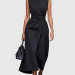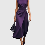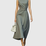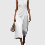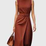 Ta sukienka charakteryzuje się czystym okrągłym dekoltem, bez rękawów oraz delikatnie drapowanym krojem, który opada tuż poniżej kolana. Z łagodnymi fałdami w talii i wyrafinowaną sylwetką, podkreśla figurę, pozostając jednocześnie niezwykle elegancka. Dyskretne rozcięcie po boku dodaje ruchu, co czyni ją idealną zarówno na dzień, jak i na wieczór.