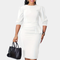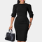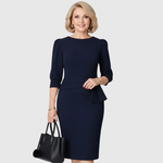 Ta elegancka sukienka ma dopasowany krój z falbanką w stylu peplum w talii, która podkreśla krągłości i dodaje odrobiny wyrafinowania. Rękawy o długości trzech ćwiartek zapewniają elegancki wygląd, podczas gdy usztywniony gorset zapewnia gładkie, przylegające do sylwetki dopasowanie. Zaprojektowana z odpowiednią ilością zakrycia i ciepła, jest idealna na chłodniejsze dni jesieni i zimy, nie rezygnując z stylu.