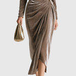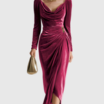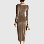Ta luksusowa sukienka midi ma miękki dekolt w kształcie łuku oraz długie, marszczone rękawy, co tworzy elegancką sylwetkę. Aksamitny materiał pięknie opada na ciało, podkreślony delikatnym marszczeniem w talii i złotym akcentem. Dzięki asymetrycznemu dołowi i korzystnemu marszczeniu, to idealny element na formalne wieczory lub eleganckie uroczystości.