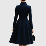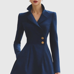 Ta wyrafinowana sukienka w stylu płaszcza ma pięknie uformowany kołnierz, rzeźbione ramiona oraz dopasowany gorset, który płynnie przechodzi w delikatną spódnicę w kształcie litery A. Czyste krawiectwo tworzy pochlebną, wydłużoną sylwetkę, podczas gdy eleganckie detale z guzikami dodają odrobinę klasycznego uroku. Jej wypolerowany wygląd sprawia, że jest idealna na formalne okazje, wyrafinowane spotkania lub podniesione codzienne stylizacje.