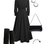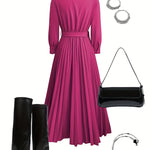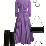 Ta sukienka ma korzystny dekolt w kształcie litery V i długie rękawy z mankietami, co zapewnia zrównoważony, wyrafinowany wygląd. Dopasowana talia jest podkreślona pasującym paskiem z detalem w złotym kolorze, podczas gdy pełna długość plisowanej spódnicy dodaje pięknego ruchu i elegancji. Doskonały wybór dla eleganckiego stylu i codziennego komfortu.