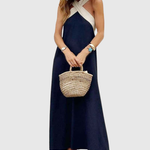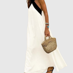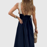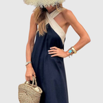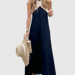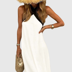 Ta stylowa sukienka ma dekolt w stylu halter, który pięknie podkreśla ramiona i linię szyi. Luźna sylwetka w kształcie litery A swobodnie opada, tworząc wygodny, ale elegancki wygląd. Jej minimalistyczny design doskonale komponuje się z letnimi akcesoriami, co czyni ją idealnym wyborem na wakacje, spacery po plaży czy casualowe spotkania w słońcu.