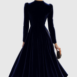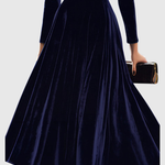 Przyjmij wyrafinowaną elegancję z tą oszałamiającą granatową sukienką midi z aksamitu — arcydziełem ponadczasowego uroku i dyskretnego blasku. Miękka, płynąca tkanina łapie światło przy każdym ruchu, podczas gdy dopasowana góra i rozkloszowany dół tworzą piękną kobiecą sylwetkę. Idealna na wieczorne wydarzenia, formalne kolacje lub zimowe uroczystości, emanuje cichą pewnością siebie i klasycznym wdziękiem.