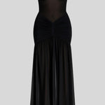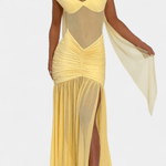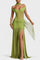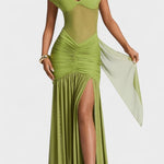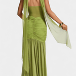 Głęboki dekolt w kształcie litery V oraz odkryte plecy tworzą wyrafinowany wygląd, podczas gdy strategiczne fałdy naturalnie modelują postać. Dodatkowo, rozporek sięgający do wysokości uda wprowadza odrobinę odważnej elegancji.