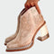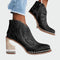 Nowoczesne botki damskie w stylu western, z wyjątkowymi haftami i dekoracyjnymi detalami na podeszwie. Obcas w stylu drewna z przezroczystym wstawką nadaje im unikalnego charakteru i elegancji, podczas gdy komfortowe dopasowanie sprawia, że są idealne do modnych stylizacji od rana do wieczora. Element wyróżniający, który łączy wygodę z zdecydowanym stylem.
